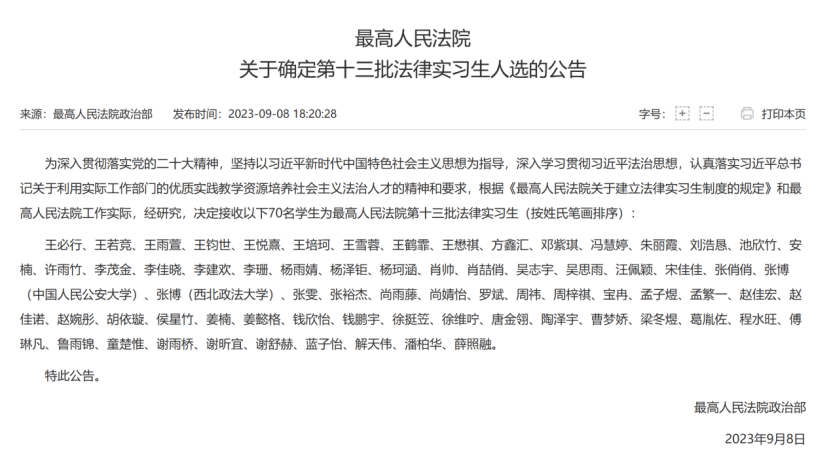近日,最高人民法院公布了第十三批法律实习生人选名单,公司有3名研究生成功入选,分别是法学理论专业2021级硕士研究生王雪蓉、法律(法学)专业2022级硕士研究生赵佳宏、法律(法学)专业2022级硕士研究生蓝子怡。