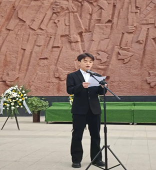 员工代表石俊辉向革命先烈献词,表达对革命先烈的追思与同学们完成新时代使命的坚定信念。