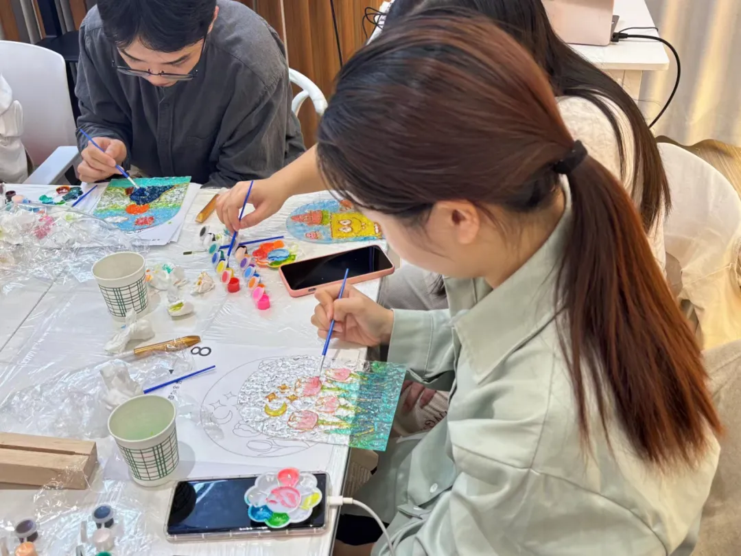 10月7日,公司策划了“追光而遇,与光同行”壁画夜灯主题活动,同学们在专业老师的帮助下制作玻璃画小夜灯,感受艺术氛围的同时展现爱国热情。晓明老师对同学们进行制作工序的细致讲解和实践指导,鼓励大家自由创作,同学们在认真完成作品后纷纷拍照留念。