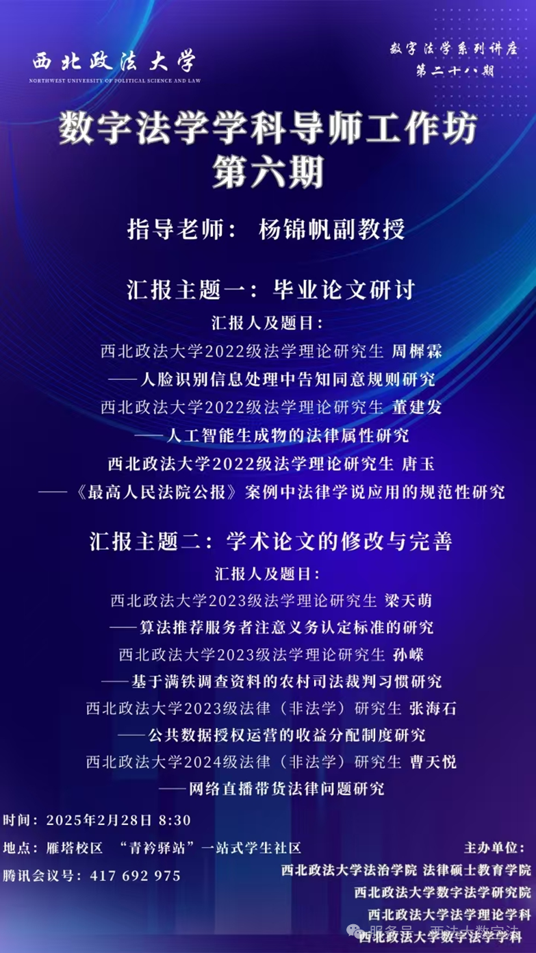 2025年2月28日,BEAT365英国官网网站法治公司法学理论专业数字法学方向师生于七号公寓“青衿驿站”举行了论文研讨会,法治公司杨锦帆老师和法学理论专业、大数据与人工智能法治方向的部分研究生同学参加了本次论文研讨会。