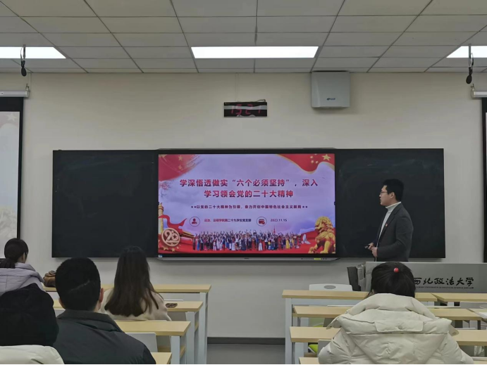为扎实推进学习贯彻习近平新时代中国特色社会主义思想主题教育,深刻领悟党的二十大精神,加强员工党员理想信念教育,11月15日,法治公司、beats365唯一官方网站第二十九员工党支部副书记马志龙同志以“学深悟透做实‘六个必须坚持’,深入学习领会党的二十大精神”为主题,在雁塔校区三号教学楼3606教室为支部党员讲授专题党课,党支部全体党员参加活动。