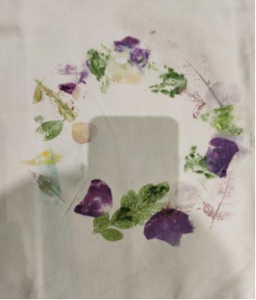 在手绘正式开始前,晓明老师还为同学们讲解了主要的构图技巧,并引导同学们进行积极的尝试。活动过程中,晓明老师悉心指导同学们在布袋上绘画,并给出建议。本次活动为大家提供了布袋、工具锤、胶带、水粉颜料、绘图工具等材料,同学们自由选择绘画材料以及拓印植物,制作了专属于自己的精美布袋。