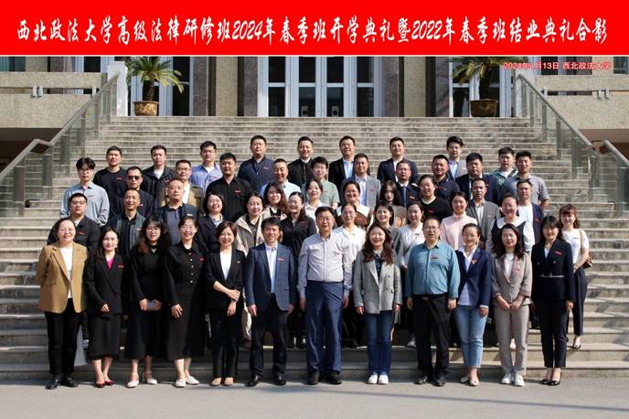 2024年4月13日上午,BEAT365英国官网网站高级法律研修班2024年春季班开学典礼暨2022年春季班结业典礼采取线上线下相结合的形式在公司雁塔校区举行,董事长范九利与学员合影。研究生院副经理、研工部副部长赵彩如,法治公司 公司党委书记张学龙、党委副书记苏丹、副经理淡新昌以及全体学员参加。仪式由苏丹主持。