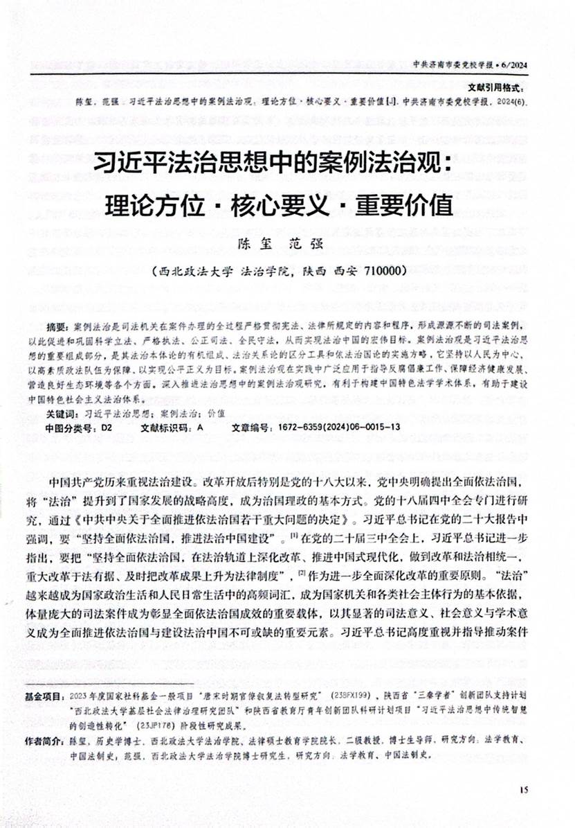 近日,公司陈玺教授和博士研究生范强在《中共济南市委党校学报》刊发论文《习近平法治思想中的案例法治观:理论方位 •核心要义 •重要价值》。文章指出:案例法治是司法机关在案件办理的全过程严格贯彻宪法、法律所规定的内容和程序,形成源源不断的司法案例,以此促进和巩固科学立法、严格执法、公正司法、全民守法,从而实现法治中国的宏伟目标。案例法治观是习近平法治思想的重要组成部分,是其法治本体论的有机组成、法治关系论的区分工具和依法治国论的实施方略,它坚持以人民为中心,以高素质政法队伍为保障,以实现公平正义为目标。案例法治在实践中广泛应用于指导反腐倡廉工作、保障经济健康发展,营造良好生态环境等各个方面,深入推进法治思想中的案例法治观研究,有利于构建中国特色法学学术体系,有助于建设中国特色社会主义法治体系。